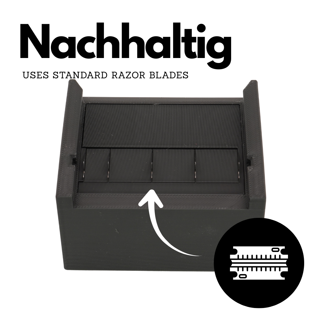 - Standard-Rasierklingen: Verwendet handelsübliche, extrem scharfe und kostengünstige Rasierklingen, die du jederzeit einfach austauschen kannst.