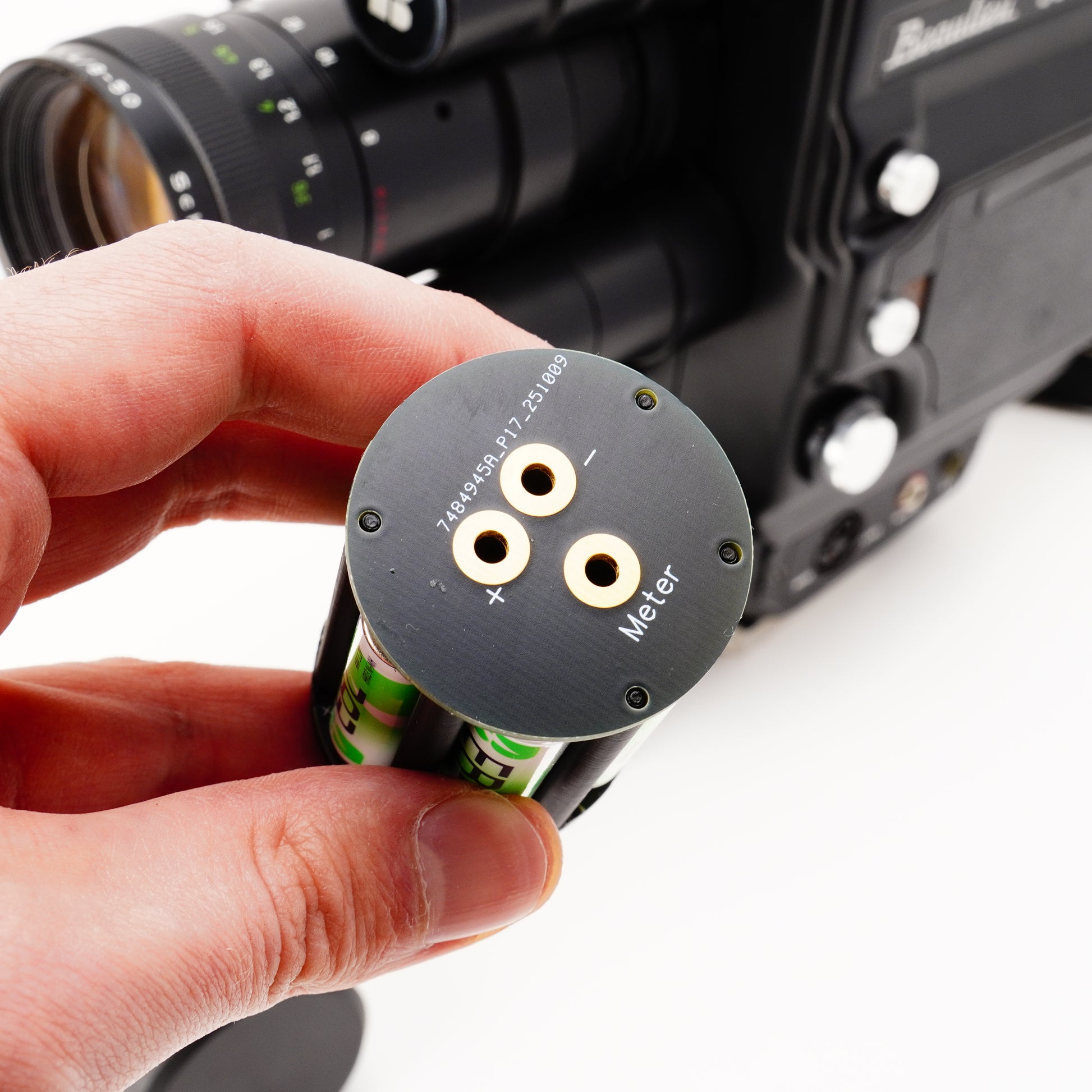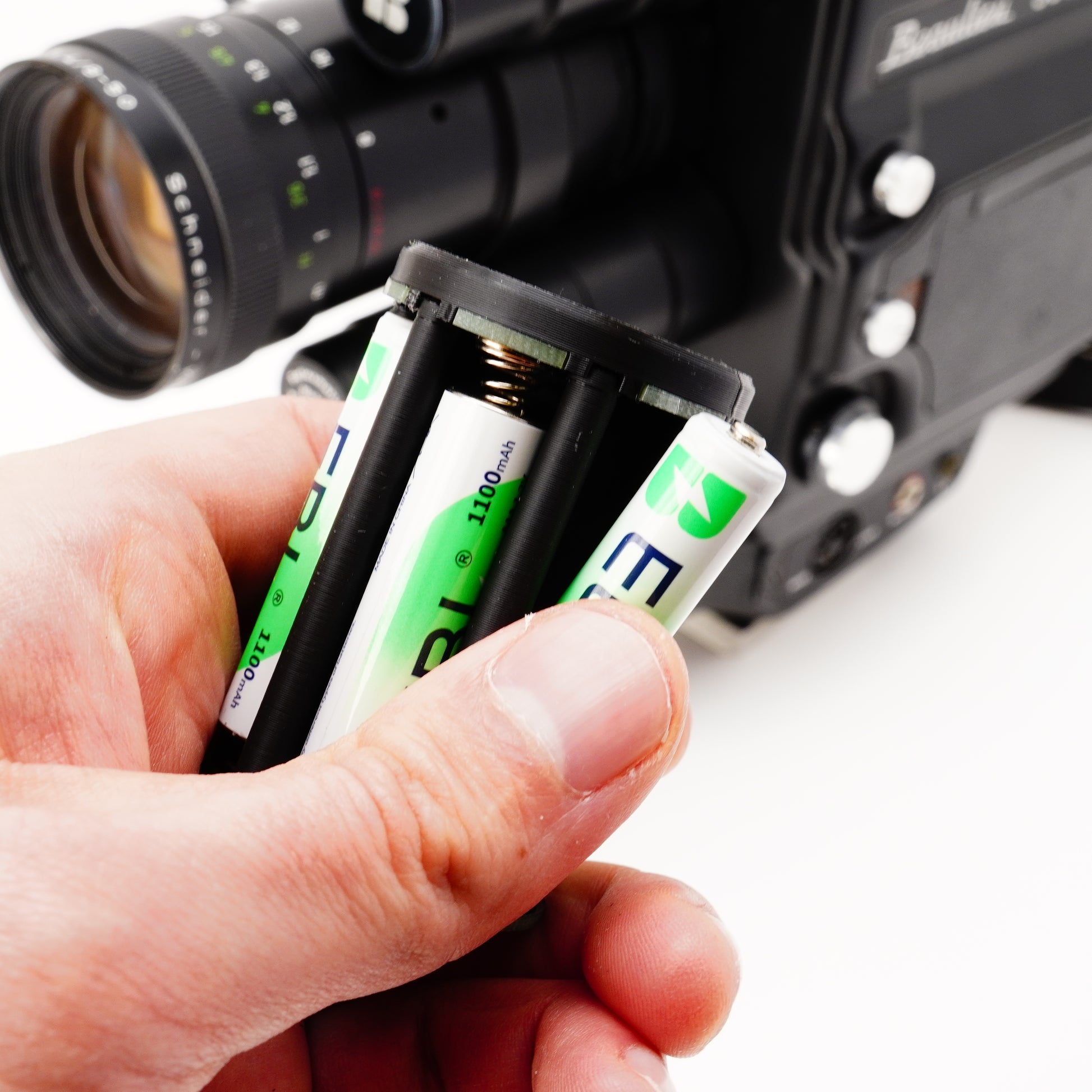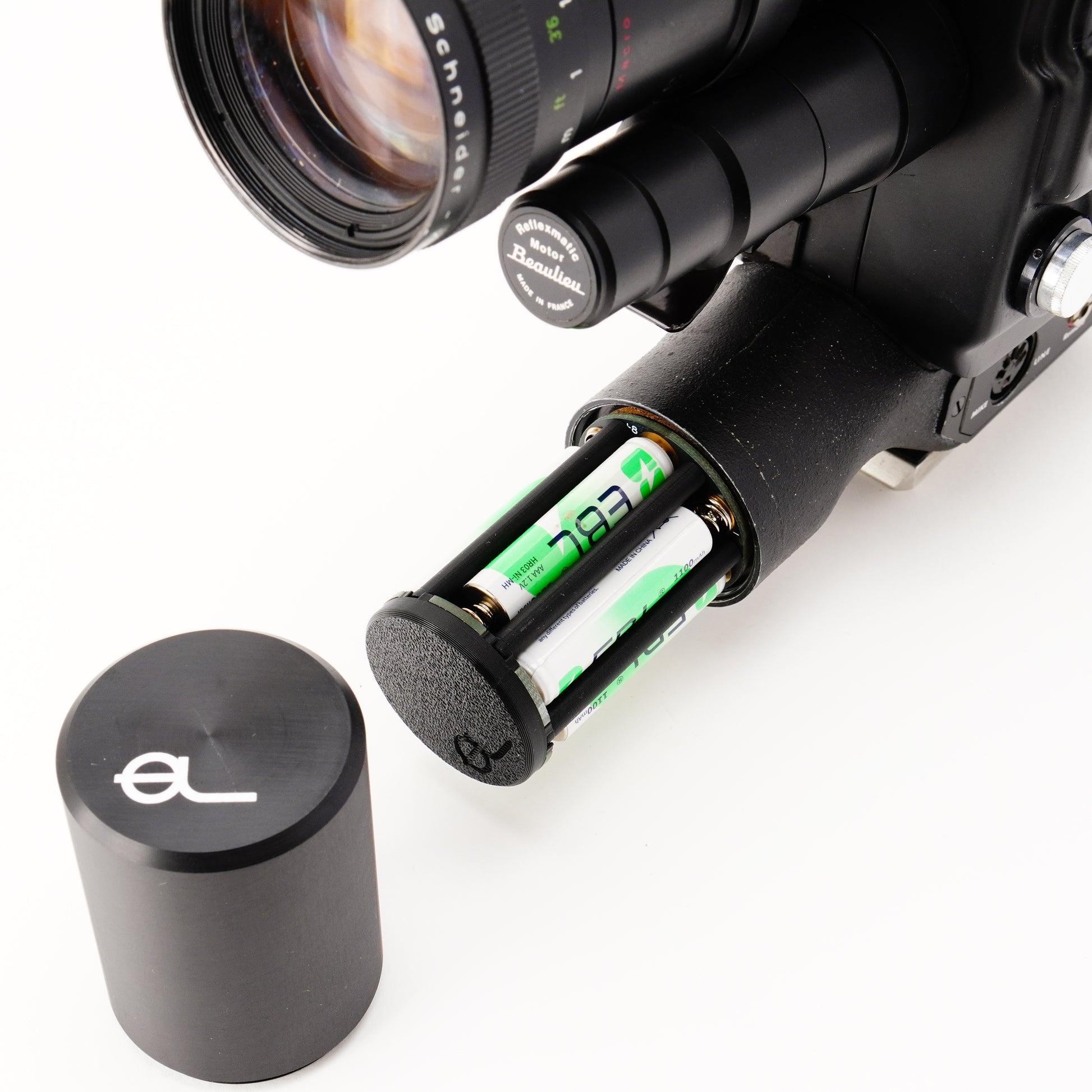 Le Beaulieu 3008 e 5008 sono senza dubbio tra le migliori cineprese Super 8 mai realizzate – se non fosse per il problema della batteria. Il nostro adattatore è la soluzione definitiva a questo problema. È stato progettato con precisione da noi e realizzato in plastica tecnica (PLA+). Il coperchio è dotato di una robusta filettatura metallica che garantisce una chiusura sicura. Grazie alla scheda elettronica sviluppata appositamente, l’adattatore assicura l’alimentazione esatta per motore ed esposimetro.
