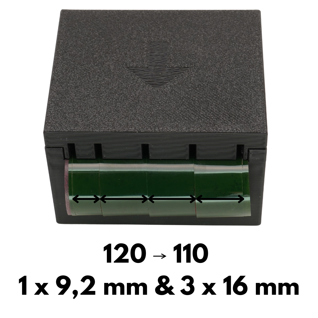 • Schnitt zu 110 (16mm): Ergibt 1 sauberen 110er Streifen aus der Mitte.